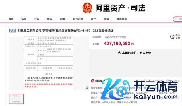 转头之前的拍卖经由,利达重工的这笔 2.46 亿股邯郸银行股权折柳在 2024 年 7 月 19 日和 8 月 27 日履历了一拍和二拍,起拍价折柳为 5.09 亿元和 4.07 亿元,十分于评估价打了 7 折和 5.6 折,但均因无东说念主出价而流拍。